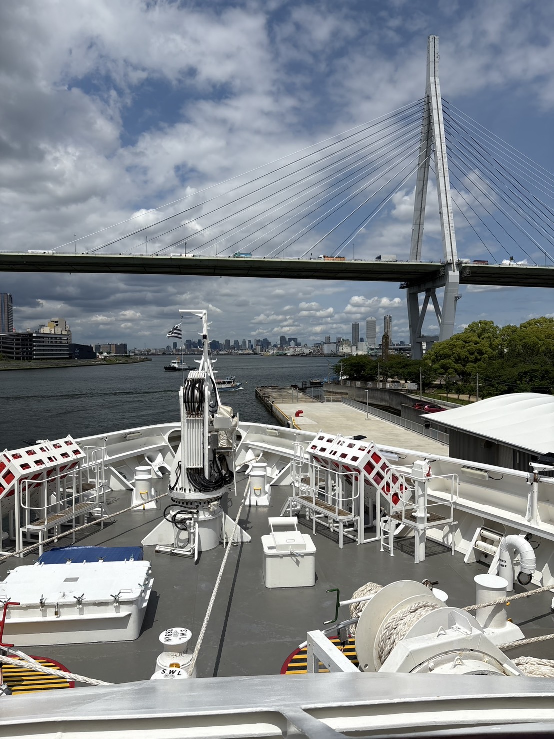 落ち着いた白を基調とした船体は、シンプルでありながらも洗練された美しさを感じさせてくれます。大阪港に静かに佇むその姿は、まるで海に浮かぶ優雅な邸宅のよう。遠目からでもひときわ目を引くその佇まいには、フランス船ならではの上品さと気品が漂っていました。