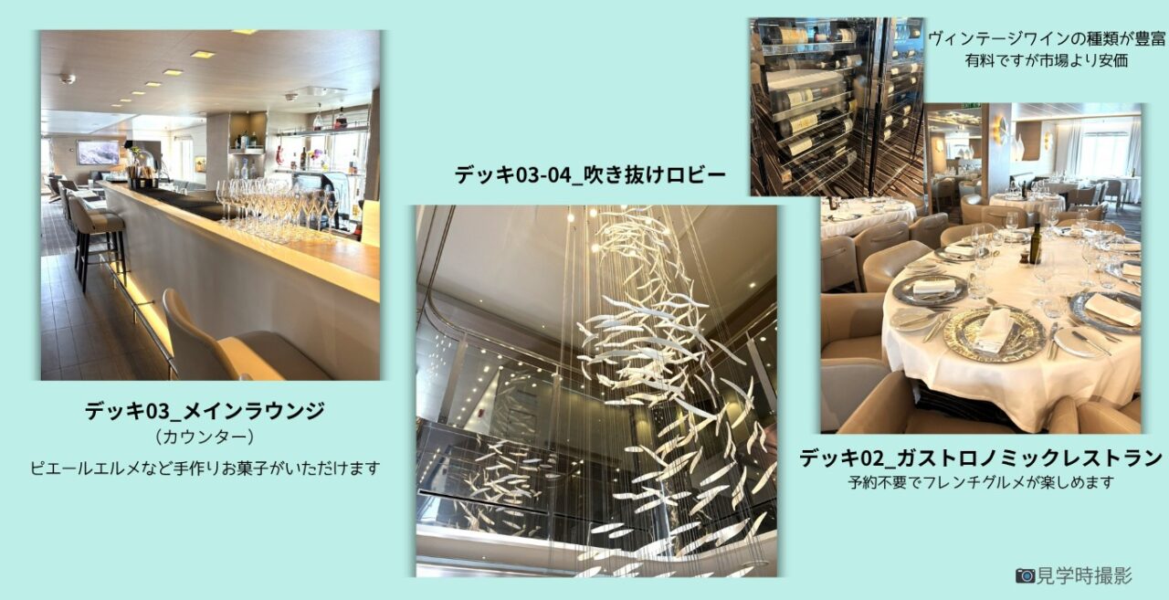 レストランでは、白を基調としたエレガントなテーブルセッティングが印象的で、まるで海の上の上質なダイニングルームにいるような気分に。料理はもちろん、ワインのセレクションも豊富で、フランス船ならではの“食のこだわり”が随所に感じられました。静かな海を眺めながらの食事は、特別な時間を演出してくれそうです。