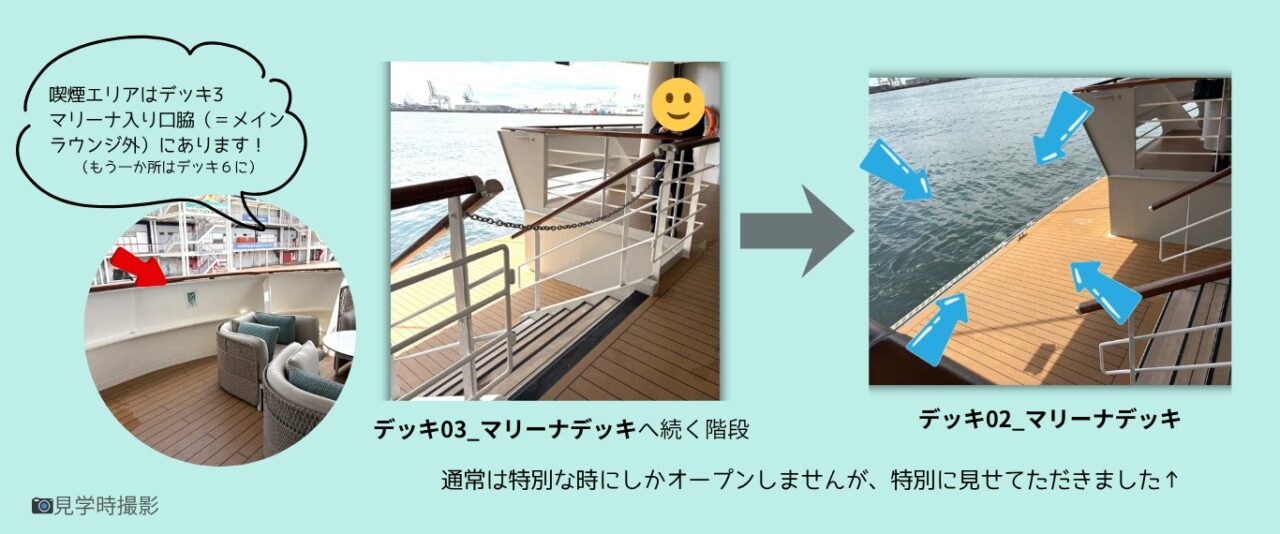 デッキ03から続く階段を下りると、目前には穏やかに揺れる海面と港の風景が広がります。